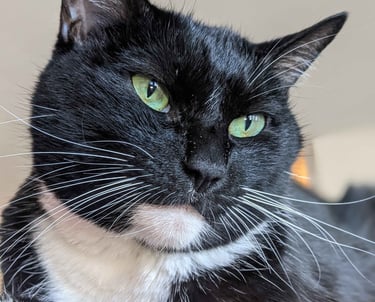 Gwendolyn brings 13 years of experience in overseeing all operations with meticulous attention to detail. This tuxedo ensures that every task is completed to the highest standards—whether it’s monitoring head pats for quality assurance or supervising productivity from her favorite sunny spot. Gwen is a firm believer in balance: work hard, but only after a head scratch.